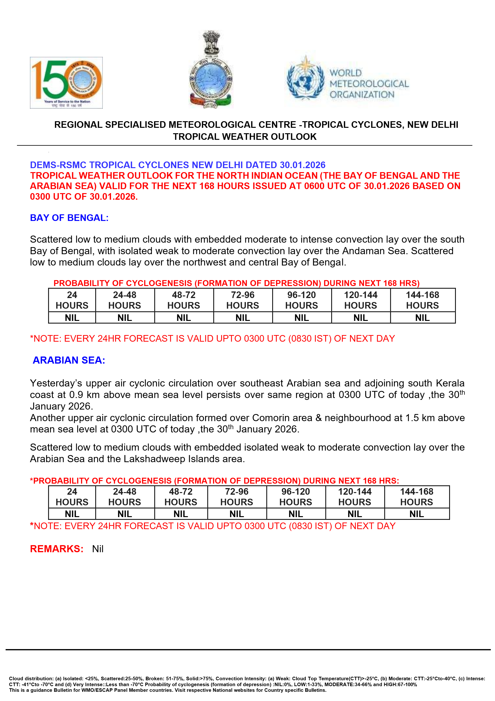Press Release dated 30.01.2026: Underthe influence of two Western Disturbance in quick succession, light to moderatescattered/ fairly widespread rainfall/snowfall likely over Western Himalayanregion and light to moderate isolated/scattered rainfall over adjoining plainsof northwest India and Central India during 31st January to 3rdFebruary. Thereafter, a third western disturbance is likely to affectNorthwestern India during 05th-07th February, 2026.