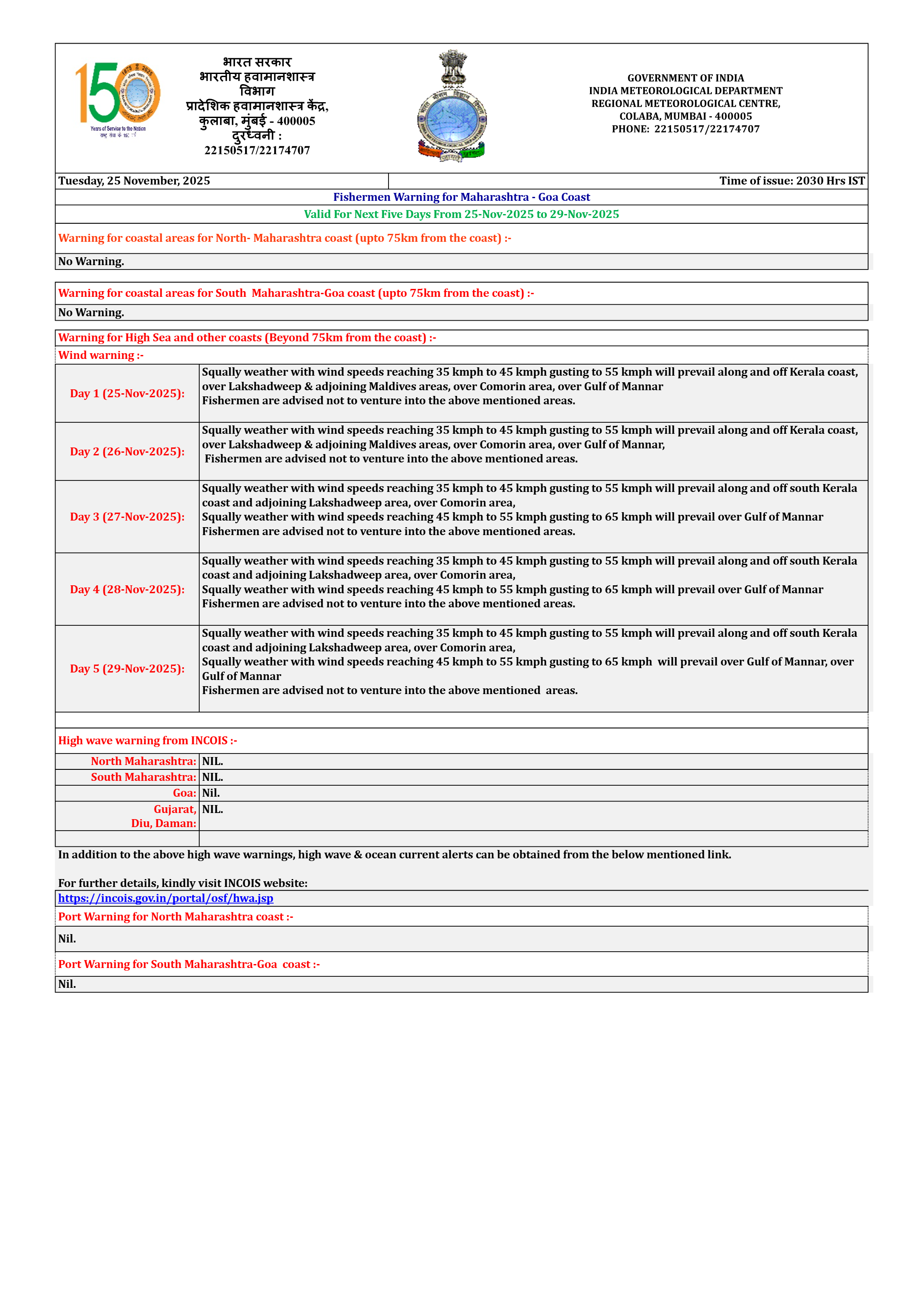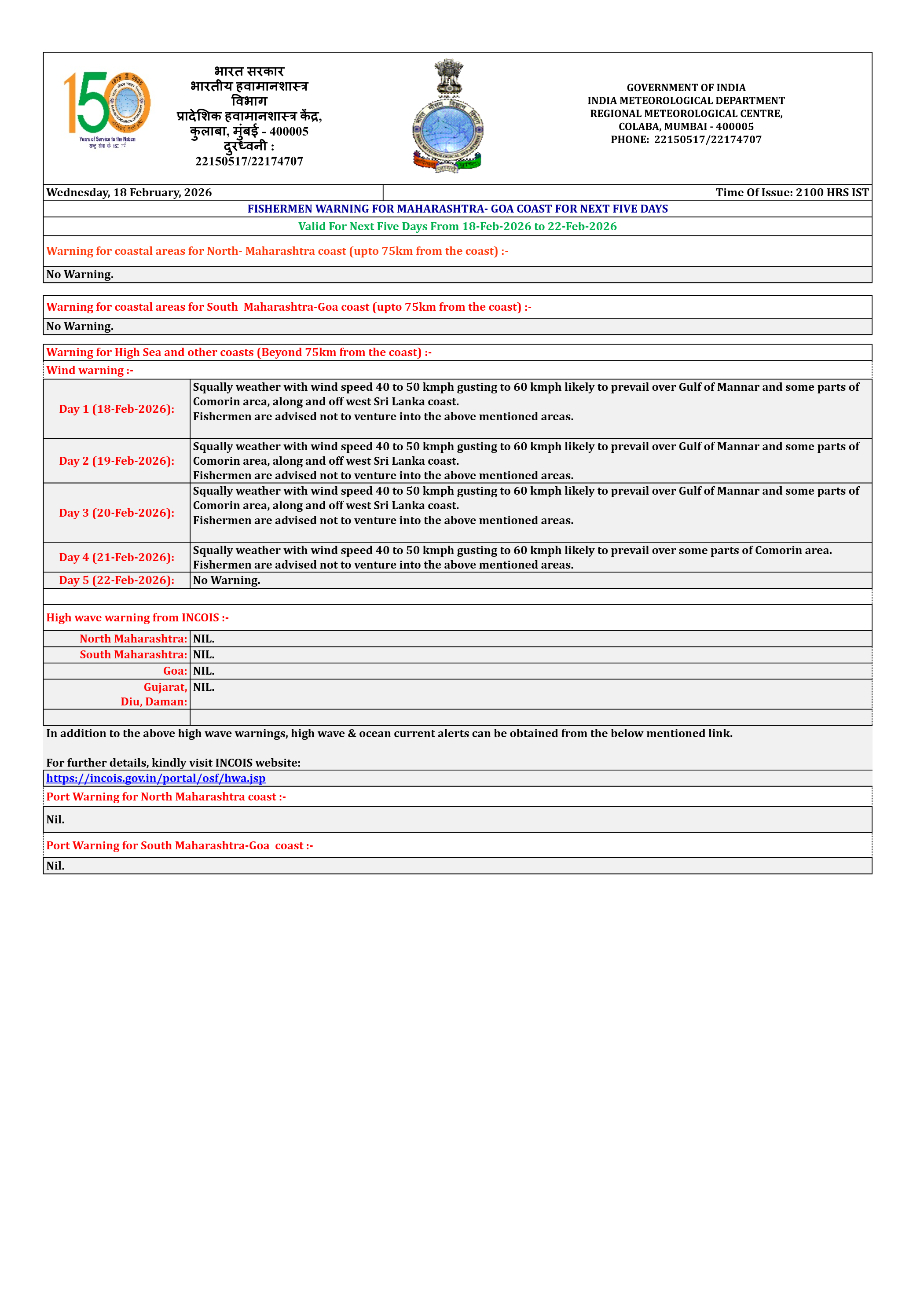 • North Maharashtra Coast, South Maharashtra coast, Goa coast, West Central Arabian Sea, East central Arabian Sea.