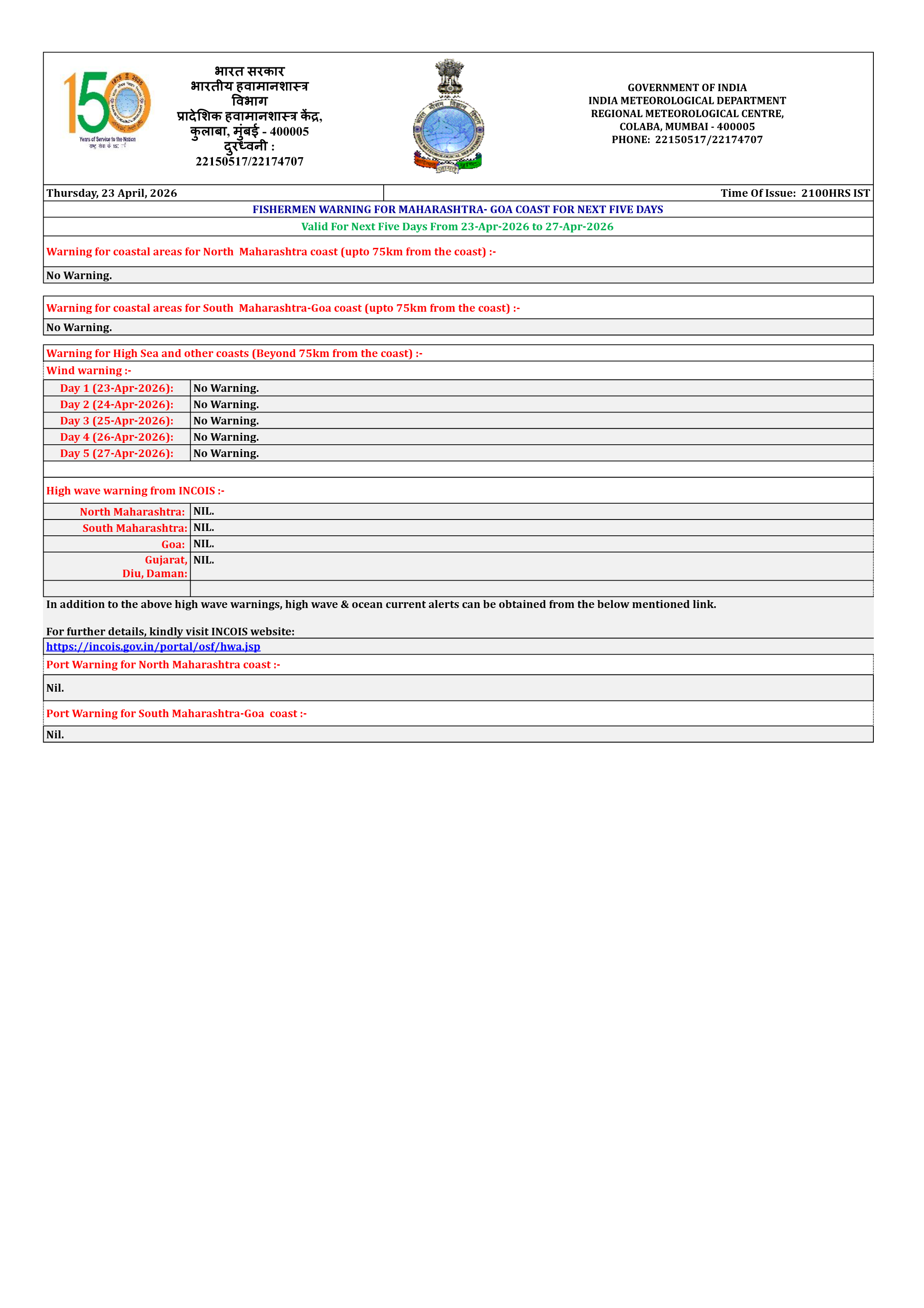 Press Release Dated: 23rd April 2026 Heat wave conditions likely over plains of northwest India, over Central during next 4-5 days & East India during next 2-3 days.